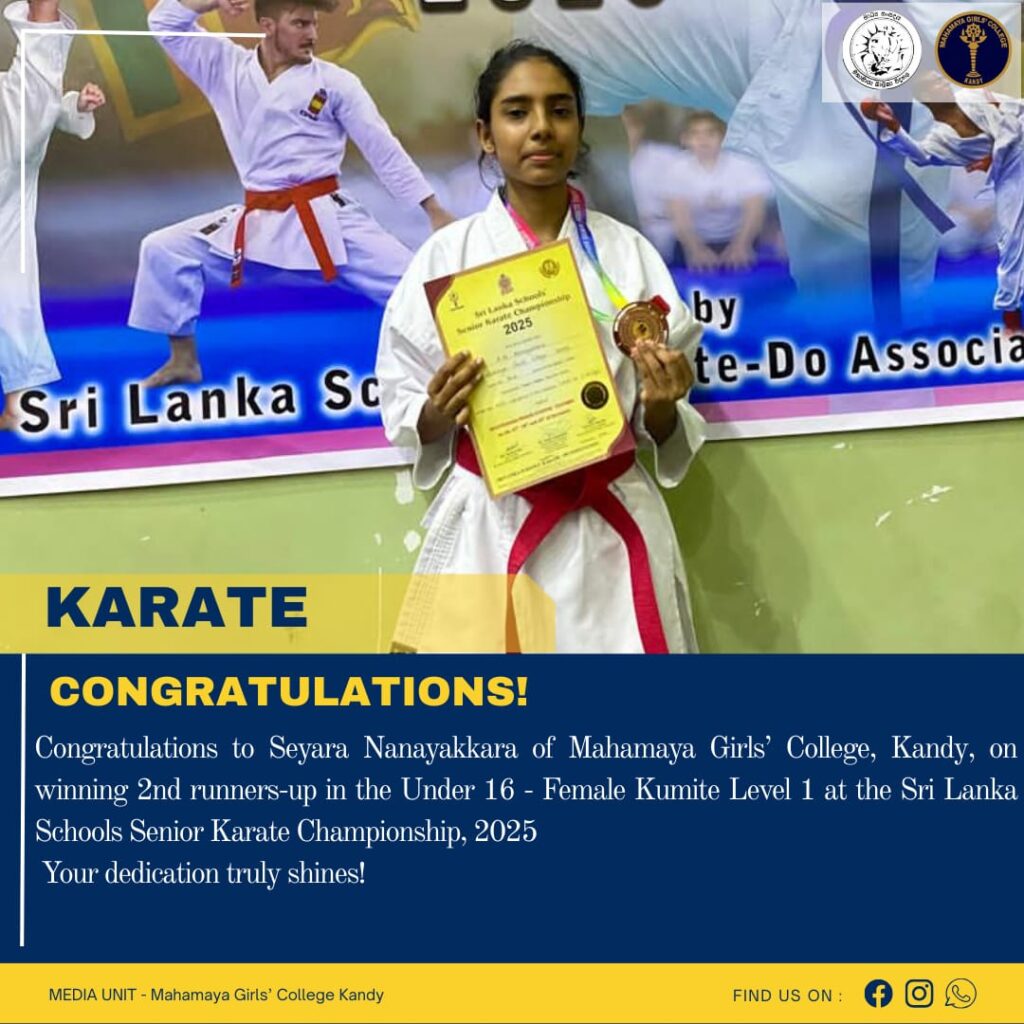 Congratulations to Seyara Nanayakkara for securing 2nd Runner-up in the Under 16 – Female Kumite (Level-1) at the Sri Lanka Schools Senior Karate Championship 2025.